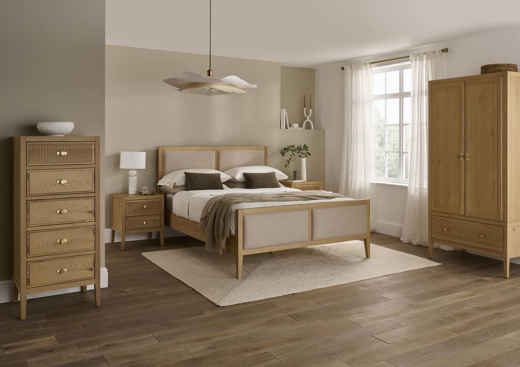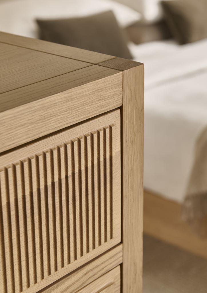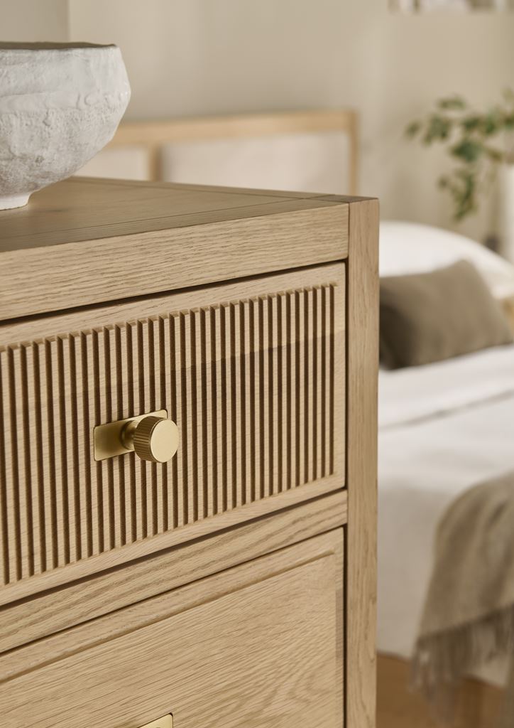 The IL Range is a study in iconic craftsmanship with a graceful nod to the elegance of Art Deco. Made from high-quality solid Oak and Oak Veneer, each element intentionally intergrated into the collection's design to highlight the natural beauty of the wood grain. A single drawer featuring delicate reeding detail, a subtle, tactile reference to classic Art Deco design, while solid brass hardware adds a soft gleam and sense of enduring quality.