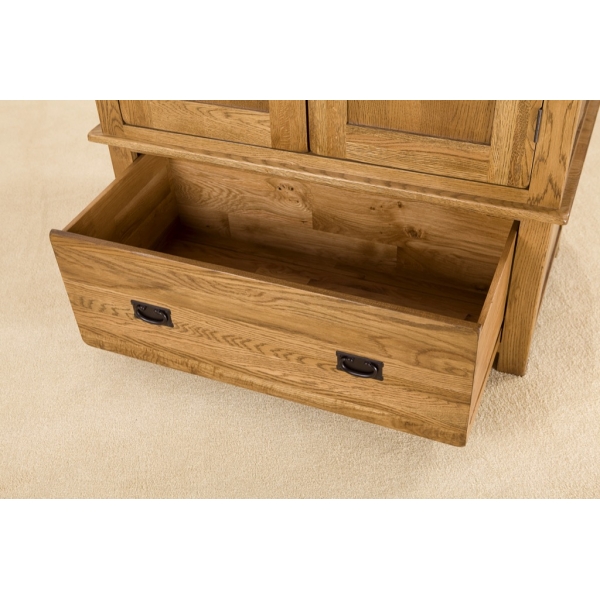 The Rustic range’s gentlemen’s one drawer wardrobe features both hanging space and a useful storage drawer. Handmade from premium quality, long-lasting American White Oak, it features a dovetailed jointed drawer and tongue and groove back and base, as well as elegant metal handles and a hanging rail. Smooth lined and traditional in design, it is a stylish and practical wardrobe for any bedroom. Gents one drawer wardrobe is low maintenance, as it is lacquered and so will not require re-waxing. Simply dust and polish as usual.